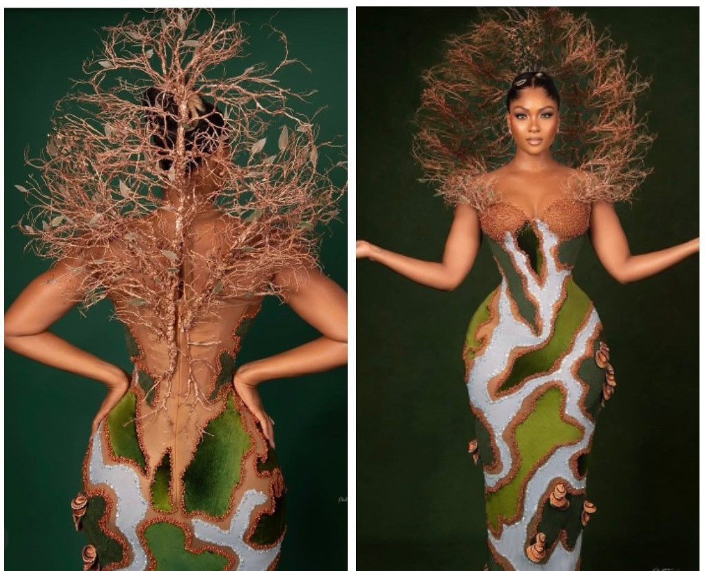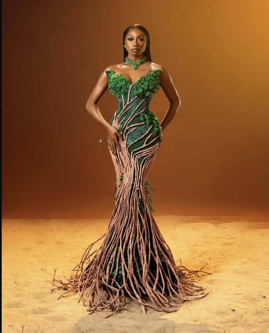 At Number 2, Doyin David gives off Tree of Life vibes in another Fashion Masterpiece. The dress is a figure-hugging ethereal forest breathtaking couture, showcasing a number of tap roots sending themselves down into the earth, with a green leaves’ effect for bodice, coordinated with leafy green earrings and necklace. Her brown skin against the perfect blend of green and brown is a stellar depiction of Mother Nature. If there is anything more than a Masterpiece, it is this look.