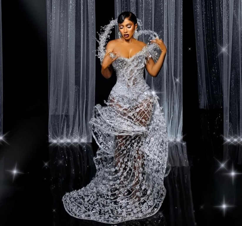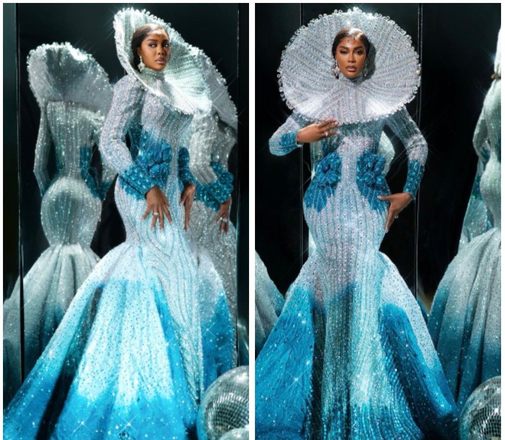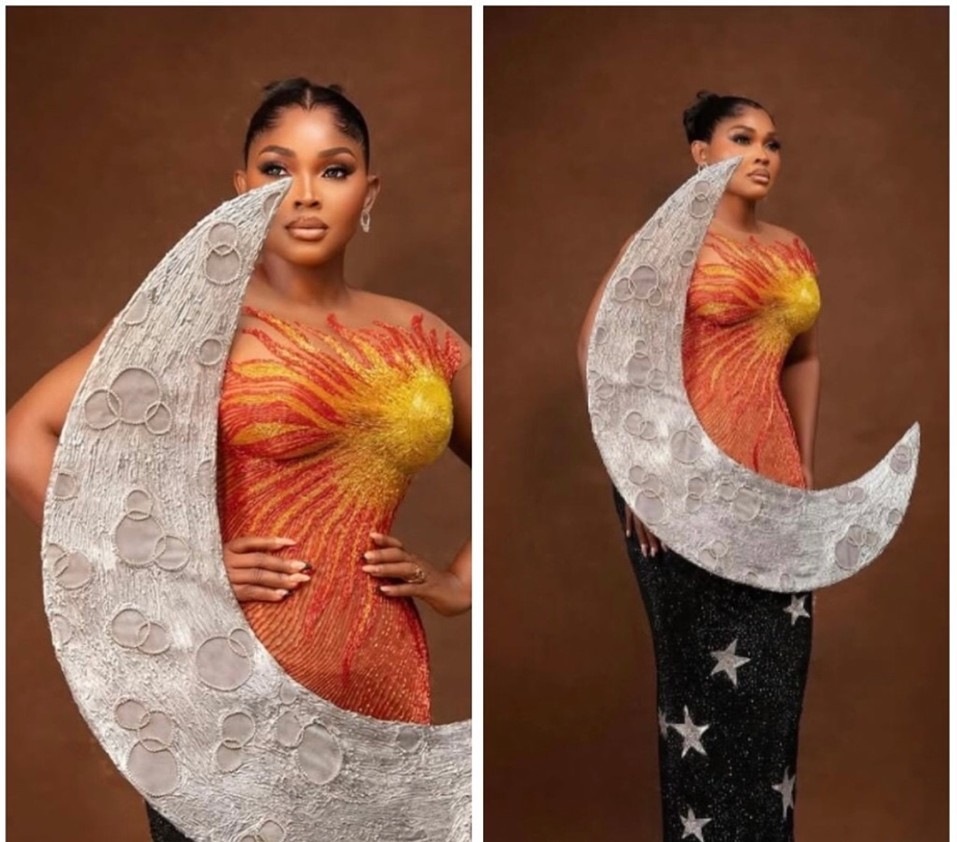 Tying at number 5 is Veekee James’ design of Mercy Aigbe’s (Literally) Sun and Moon dress! Veekee took high fashion a little (too?) far by having a perfectly fitting bodice of a dress showcasing the radiating Sun on a woman’s famous ‘oranges’. With a 3D moon and twinkling stars and starlets on a figure-hugging dress. The effect was a literal cosmic fusion curated by the powerhouse that is both Veekee James’ along with the one who won Best Supporting Actress on the AMVCA 2025 night.