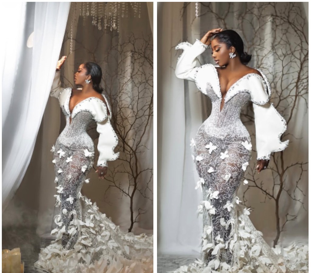 This look is giving everything it’s supposed to give, it is sensual, it is sleek, and it is elegant. Predominantly lace with a beaded bodice. The Silver combining with white brings out its ethereal flavour making it ravishing to behold. The white enlarged flair-looking sleeves give it the enhancement needed to take things a notch higher. The white 3D flowers stitched from the hip to its flowing skirt, silhouette and train intertwined with subtle silver embroidery gives it an ethereal flower garden essence which is almost divine. A definitive Masterpiece!