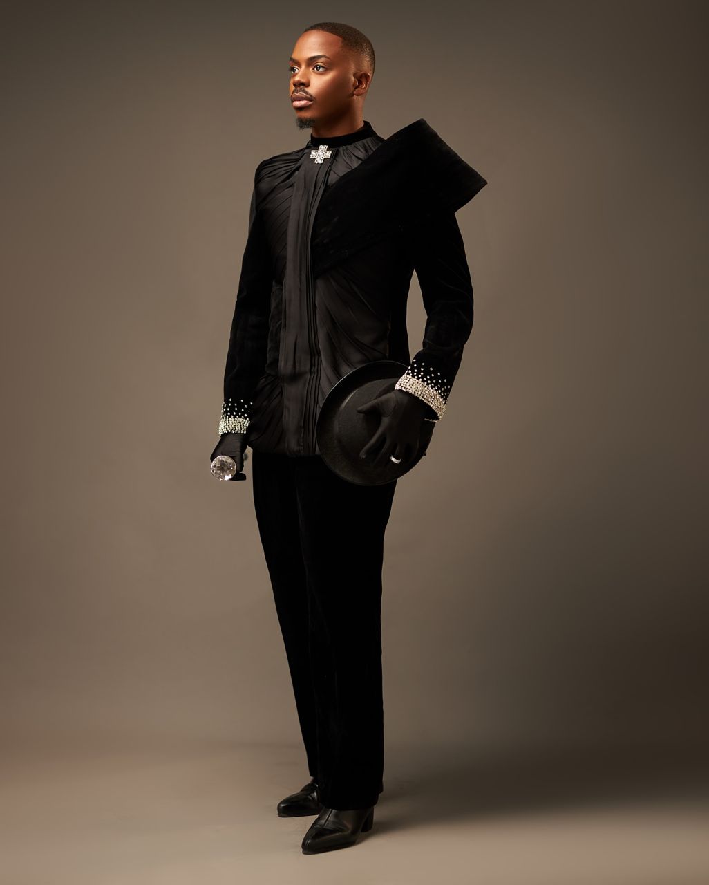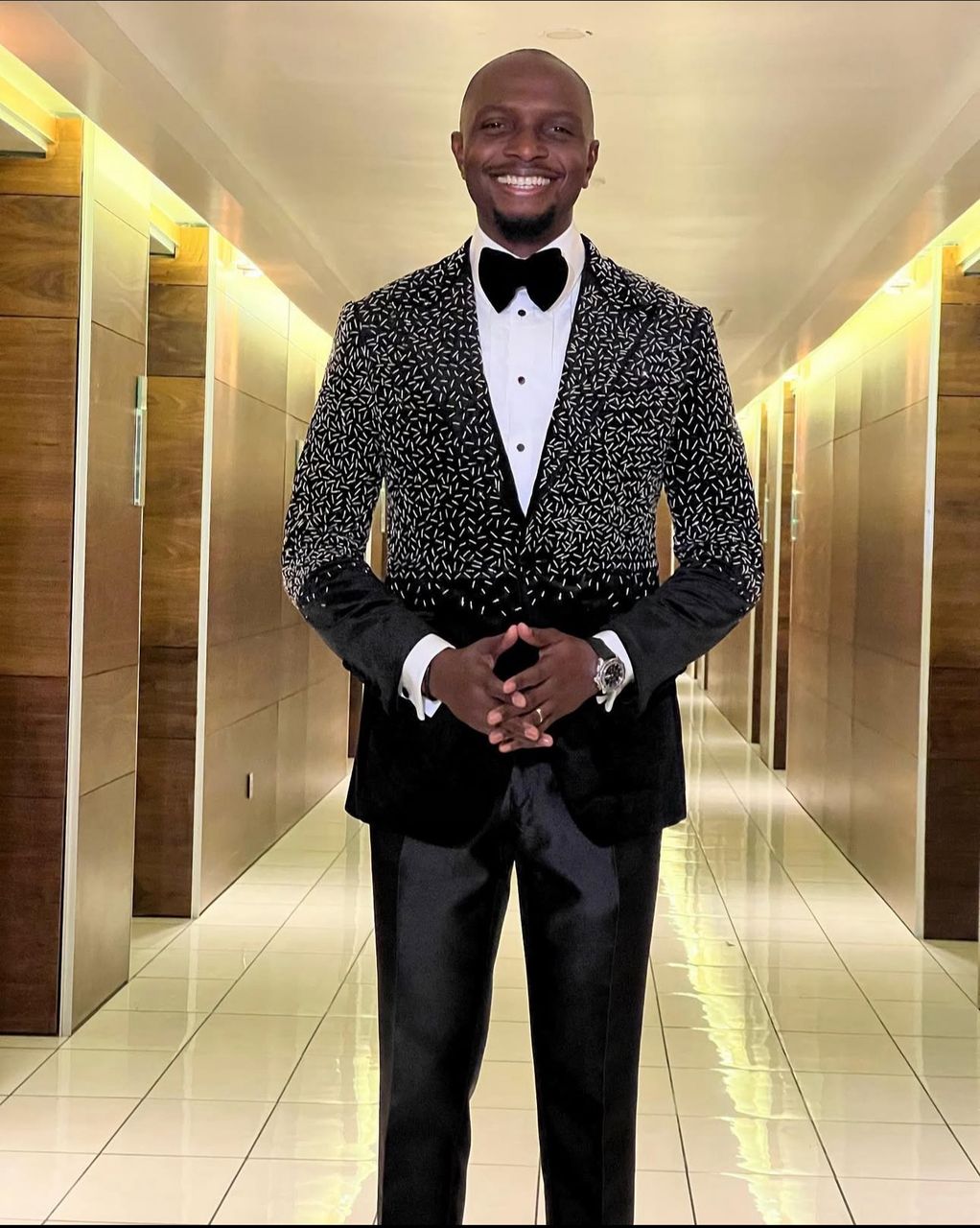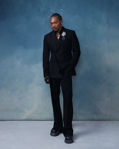 Enioluwa’s suit is dripping in Swarovski crystals, offering a dazzling and elegant appearance. The suit is well-tailored and fits very well. He complements his look with pointy black shoes, a hat, and the use of crystals for a luxurious effect!!