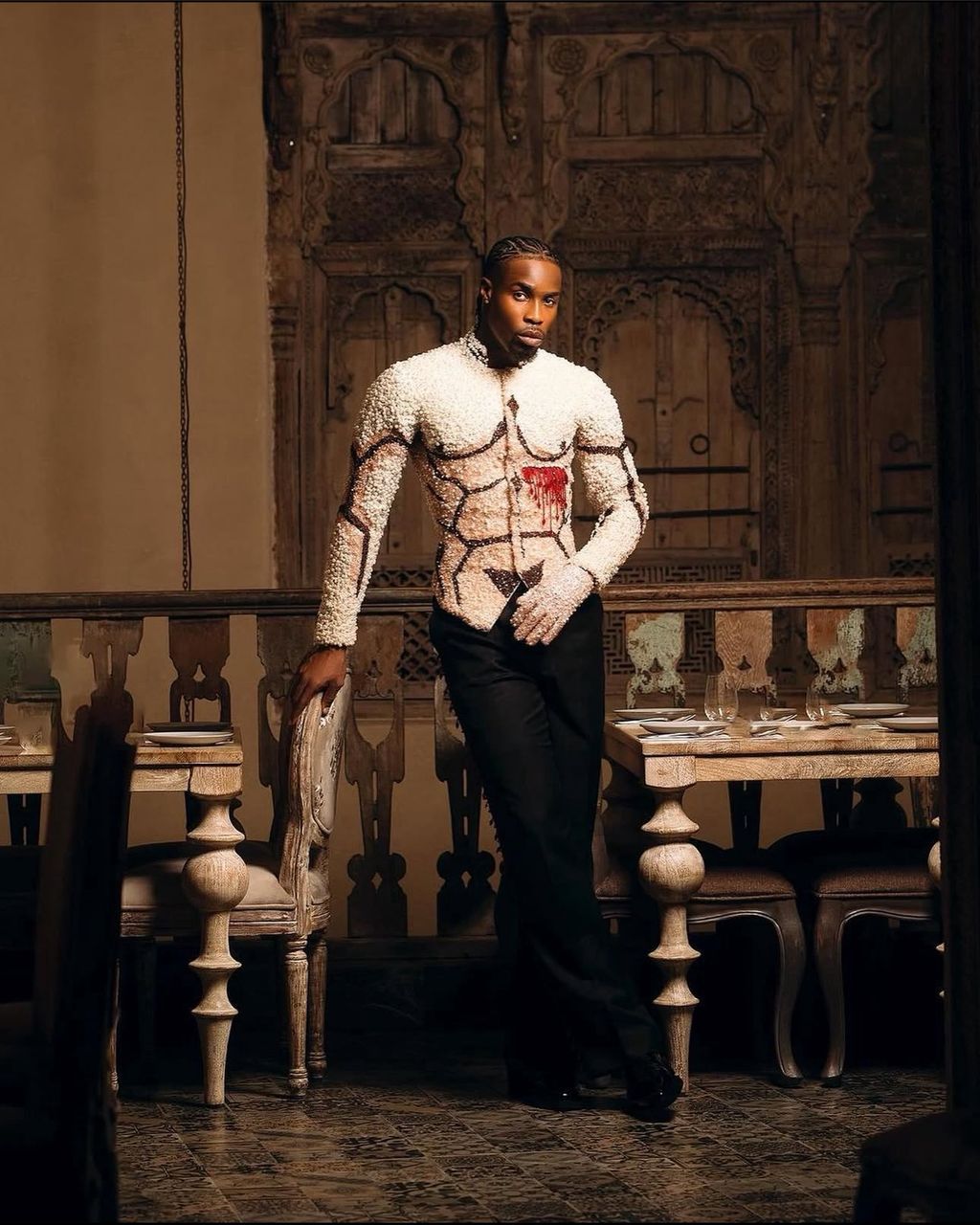 Neo Akpofure makes it to Number 5 with this flashy outfit, intricately adorned with pearl-like objects. His outfit makes it to this list for its boldness and unconventionality. His cornrowed hair cut is the icing on the cake.
